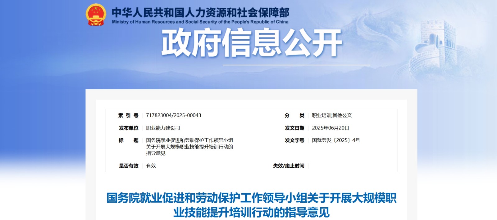 為應(yīng)對挑戰(zhàn)、擴大內(nèi)需、促進高質(zhì)量就業(yè)、助力勞動者提技增收,國務(wù)院就業(yè)促進和勞動保護工作領(lǐng)導(dǎo)小組正式印發(fā)《關(guān)于開展大規(guī)模職業(yè)技能提升培訓(xùn)行動的指導(dǎo)意見》(國就勞發(fā)〔2025〕4號)。