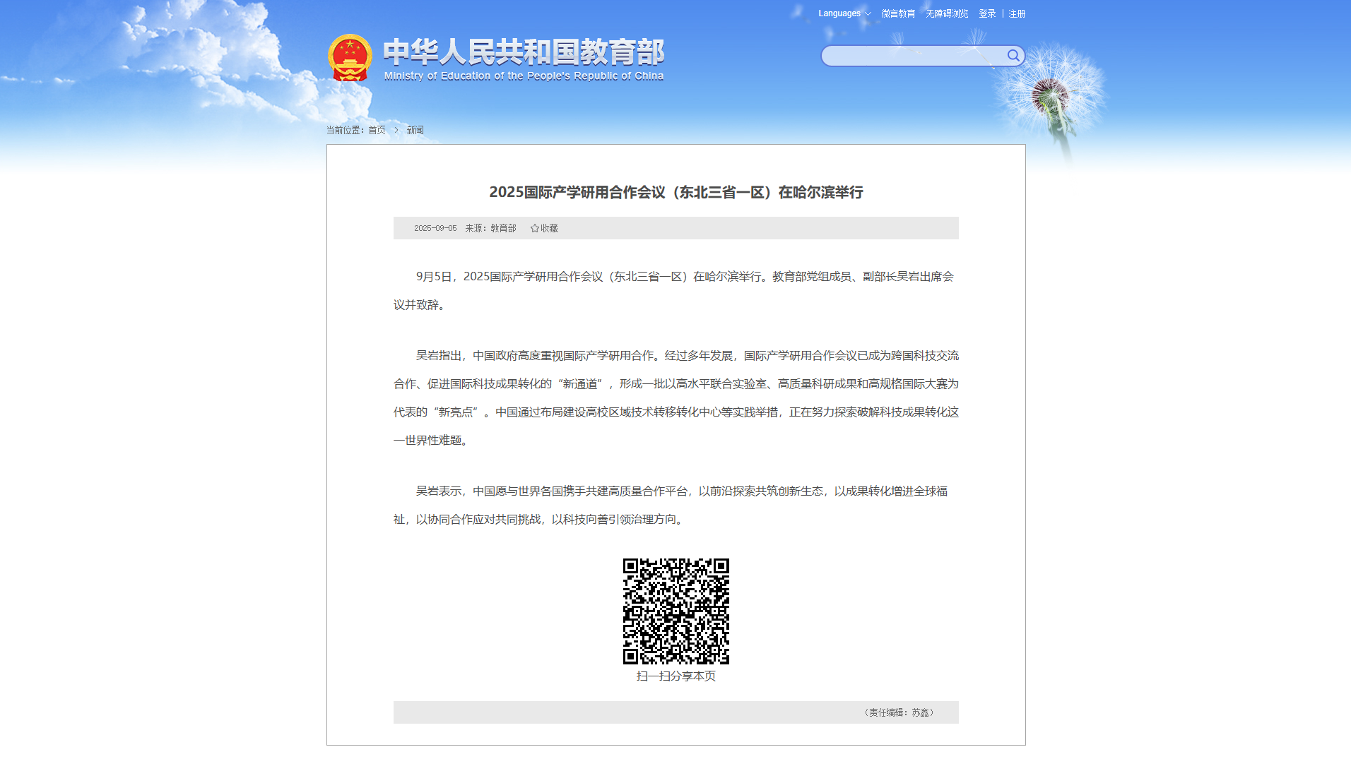 9月5日,2025國際產(chǎn)學(xué)研用合作會議(東北三省一區(qū))在哈爾濱舉行,教育部黨組成員、副部長吳巖出席并致辭。